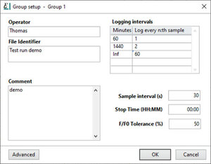 Im Fenster „Gruppen-Setup“ geben Sie den Dateinamen für die Ergebnisdatei an, ändern nach Bedarf die Protokollierungsintervalle und definieren die Endbedingungen entweder nach Zeit, F/F0 oder einer Kombination beider Kriterien.