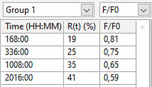 In der Tabelle „Auswertungspunkte“ können gezielt Zeitpunkte festgelegt werden, zu denen die Software automatisch den Relaxationsprozentsatz sowie das Verhältnis F/F0 berechnet.